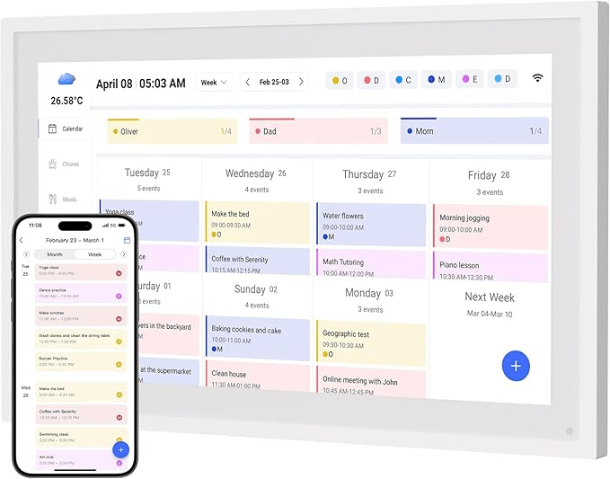 The HoziRes Digital Calendar is a 15.6” all-in-one touchscreen planner, calendar, and digital photo frame designed to help families stay effortlessly organised. Whether you’re colour-coding events for each family member, planning meals, or managing chores, this WiFi-connected device keeps everything in one place. With seamless compatibility via the eCalendar app, it supports syncing across all major calendar platforms including Google, iCloud, Outlook, Cozi and Yahoo – and best of all, all features are available without a subscription.